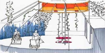 Nous avons ici une vue montrant la partie basse et le premier niveau. Dans la partie basse se situe donc les laboratoires (à gauche), et la serre qui englobe tout (à droite). Le premier niveau est en partie séparé de la serre par des parois obliques dans l'épaisseur desquels on met en place une petite pisciculture dont la double fonction est de fabriquer des protéines et de créer des écrans antiradiations. Une autre fonction, purement architecturale, est de créer des séparations ludiques et vivantes.